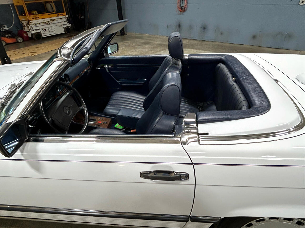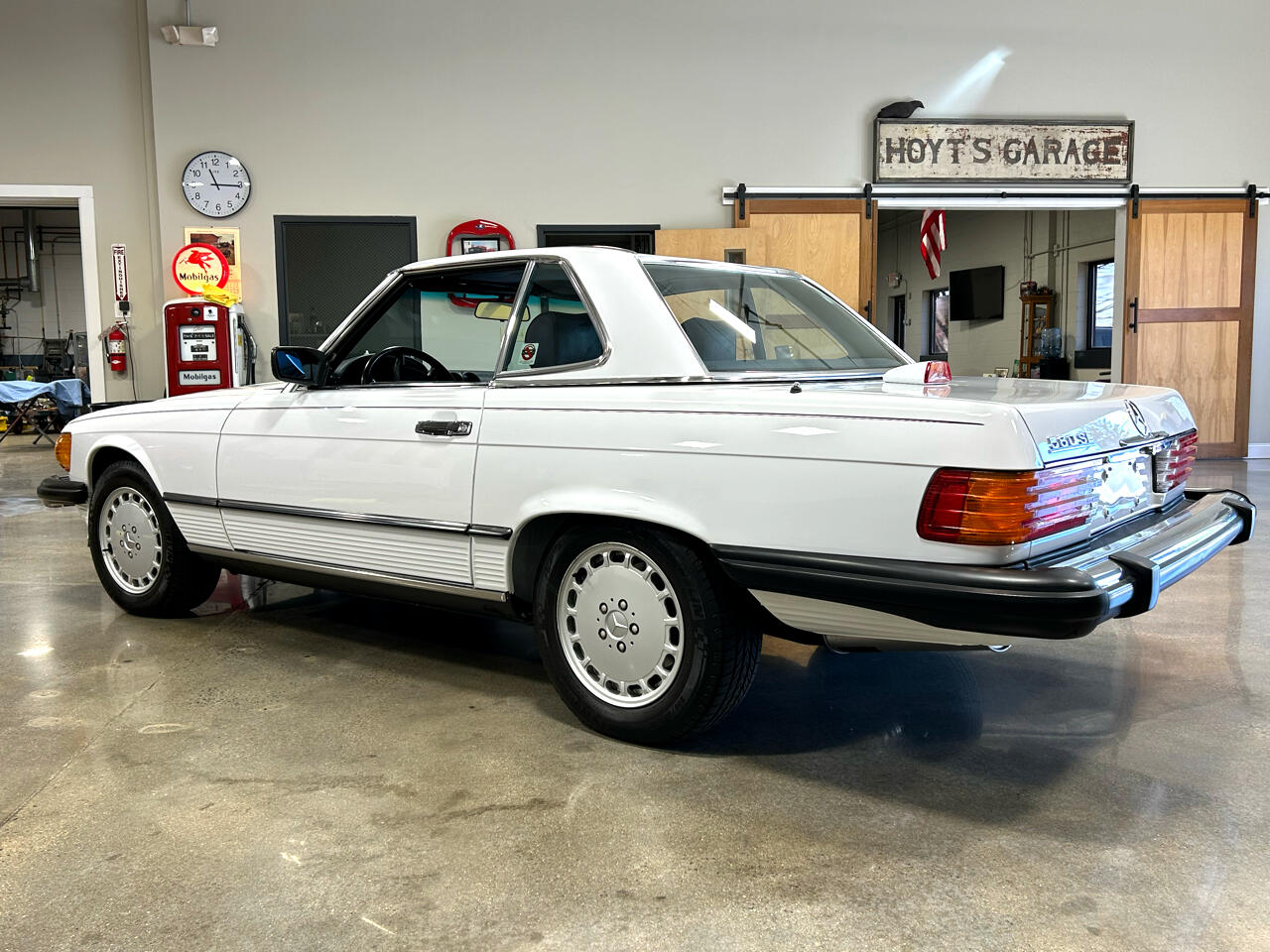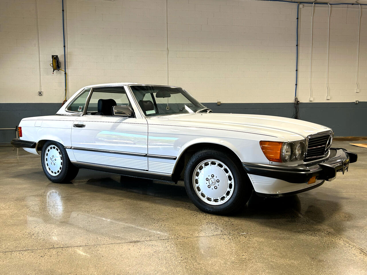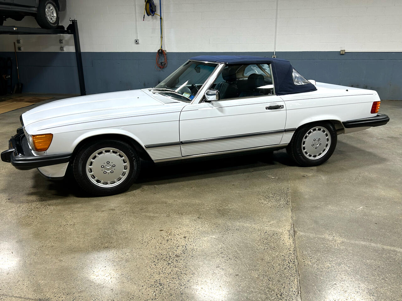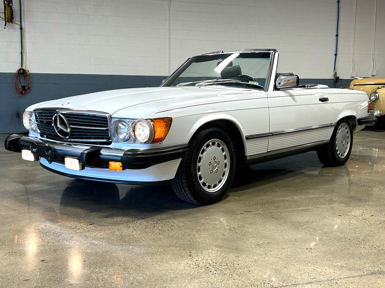 This 1987 Mercedes-Benz 560SL was purchased new by the current owner from Marsh Motors in Hamden, Connecticut, and it shows 28k miles following registration history in that state. Finished in Arctic White over blue leather upholstery, the car is powered by a 5.5-liter V8 paired with a four-speed automatic transmission. Equipment includes a limited-slip differential, a dark blue soft top, a removable hardtop, silver-finished 15? Gullideckel alloy wheels, fog lights, electric windows, central locking, cruise control, and automatic climate control. The car is finished in Arctic White (147) and features a color-matched removable hardtop and a dark blue convertible soft top. Additional exterior equipment includes fog lights, a power antenna, and chrome-accented bumpers and trim. This R107 is offered on dealer consignment with a window sticker, manufacturer’s literature, a clean Carfax report, and a Connecticut title.