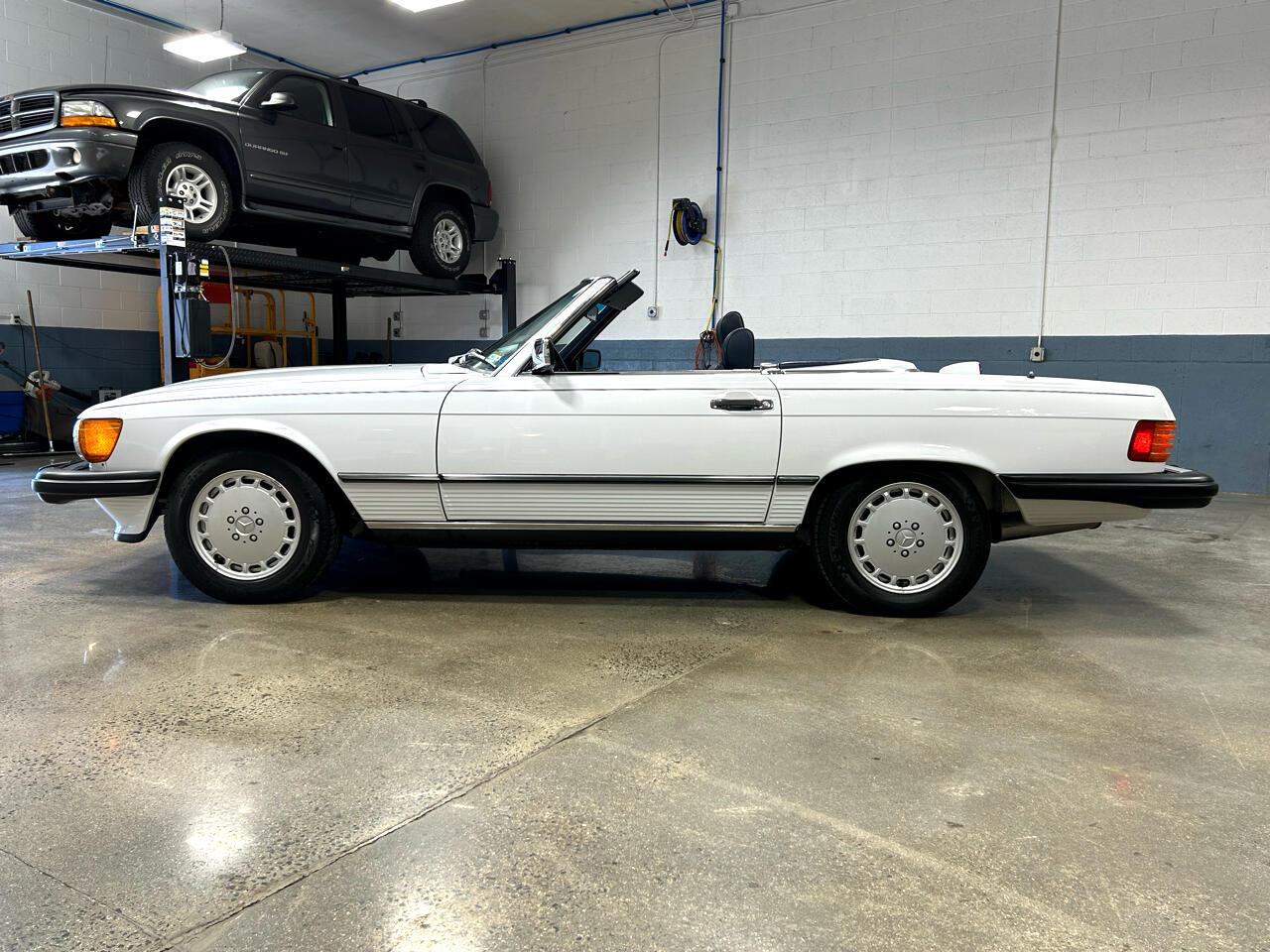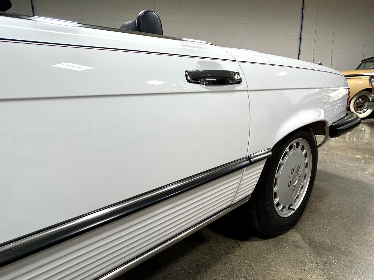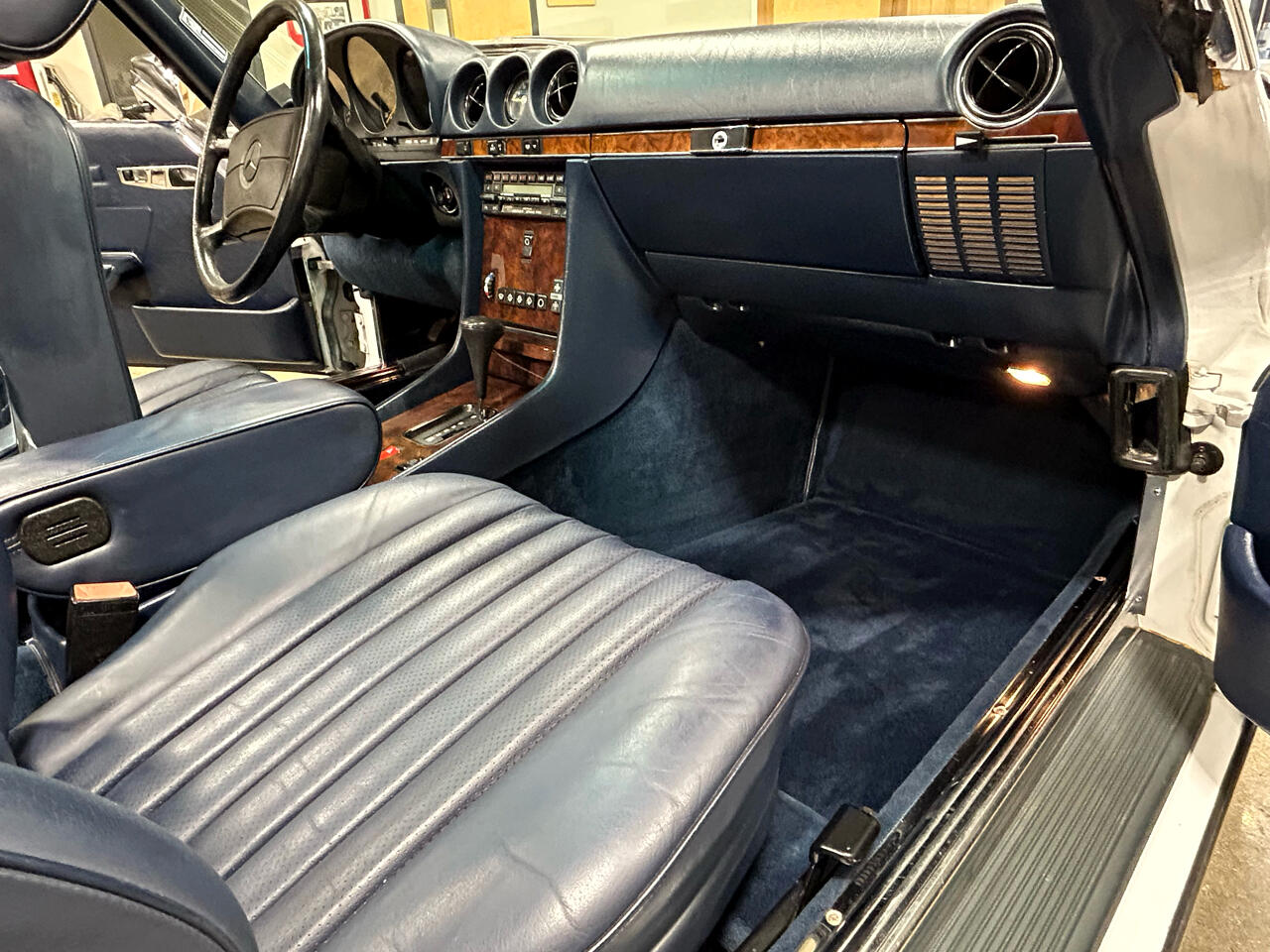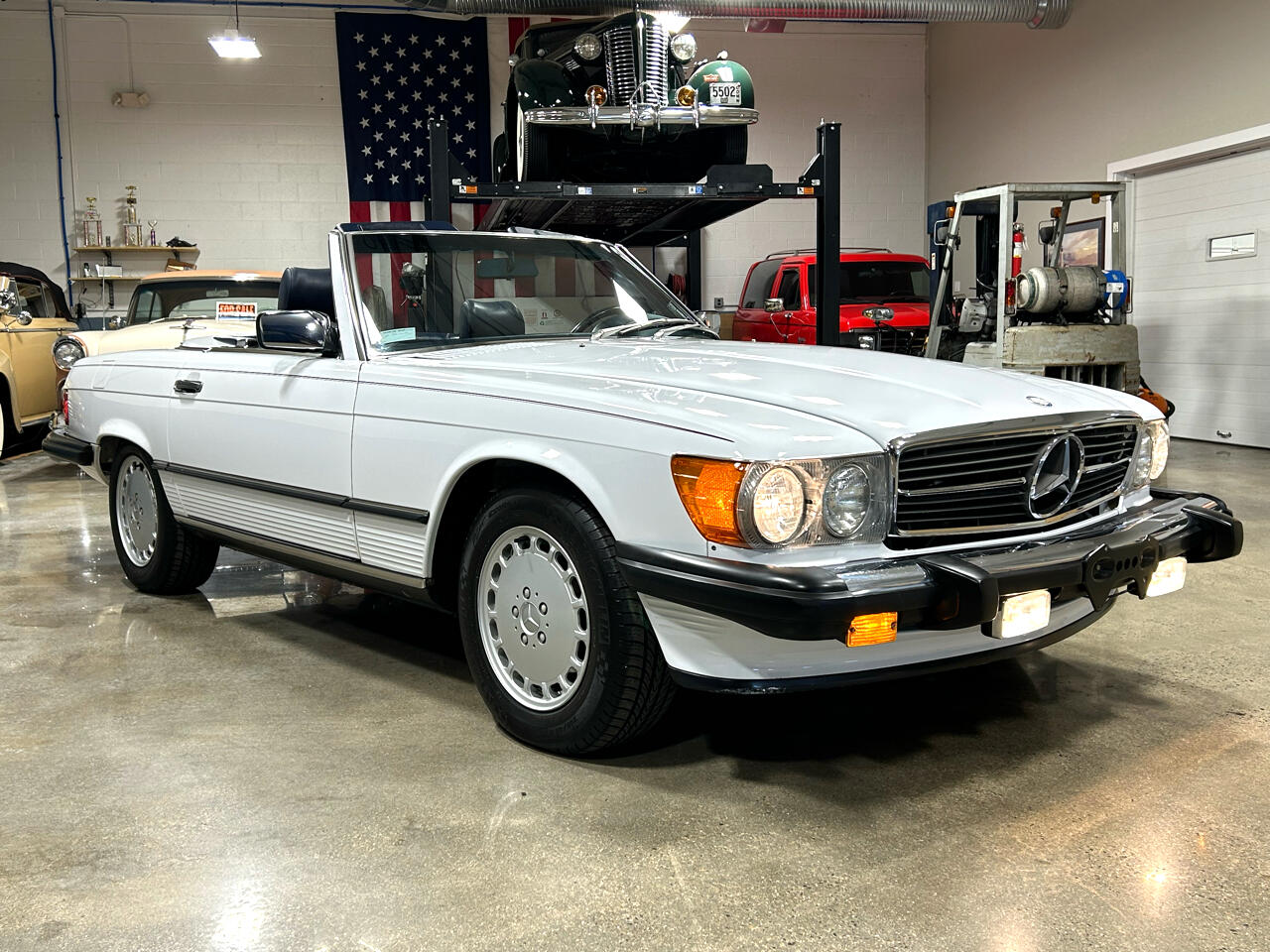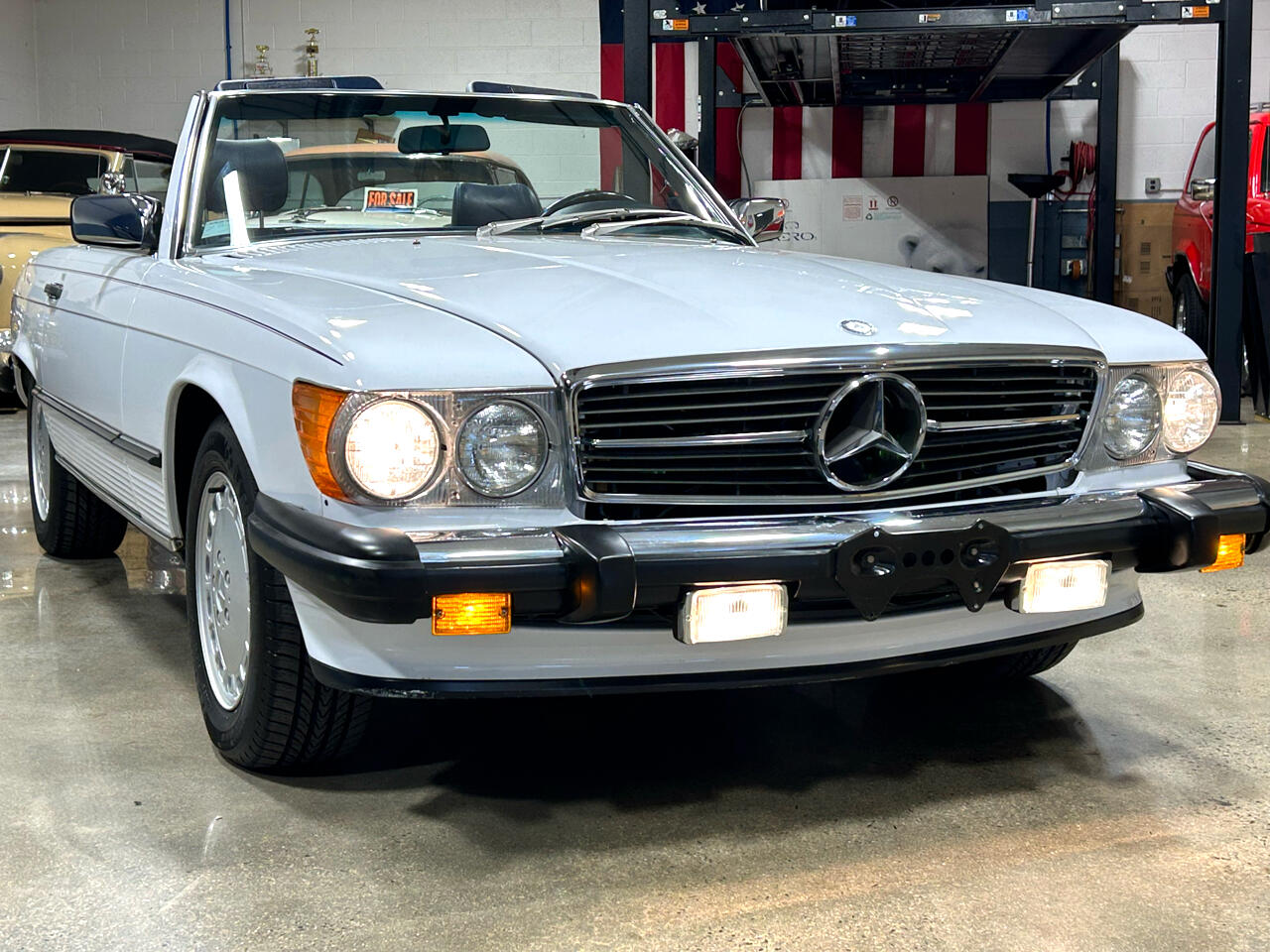 This 1987 Mercedes-Benz 560SL was purchased new by the current owner from Marsh Motors in Hamden, Connecticut, and it shows 28k miles following registration history in that state. Finished in Arctic White over blue leather upholstery, the car is powered by a 5.5-liter V8 paired with a four-speed automatic transmission. Equipment includes a limited-slip differential, a dark blue soft top, a removable hardtop, silver-finished 15? Gullideckel alloy wheels, fog lights, electric windows, central locking, cruise control, and automatic climate control. The car is finished in Arctic White (147) and features a color-matched removable hardtop and a dark blue convertible soft top. Additional exterior equipment includes fog lights, a power antenna, and chrome-accented bumpers and trim. This R107 is offered on dealer consignment with a window sticker, manufacturer’s literature, a clean Carfax report, and a Connecticut title.
