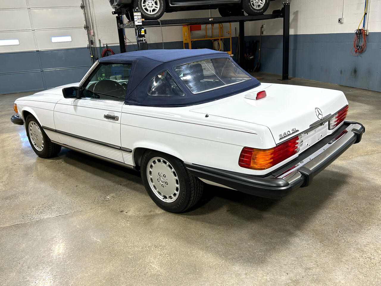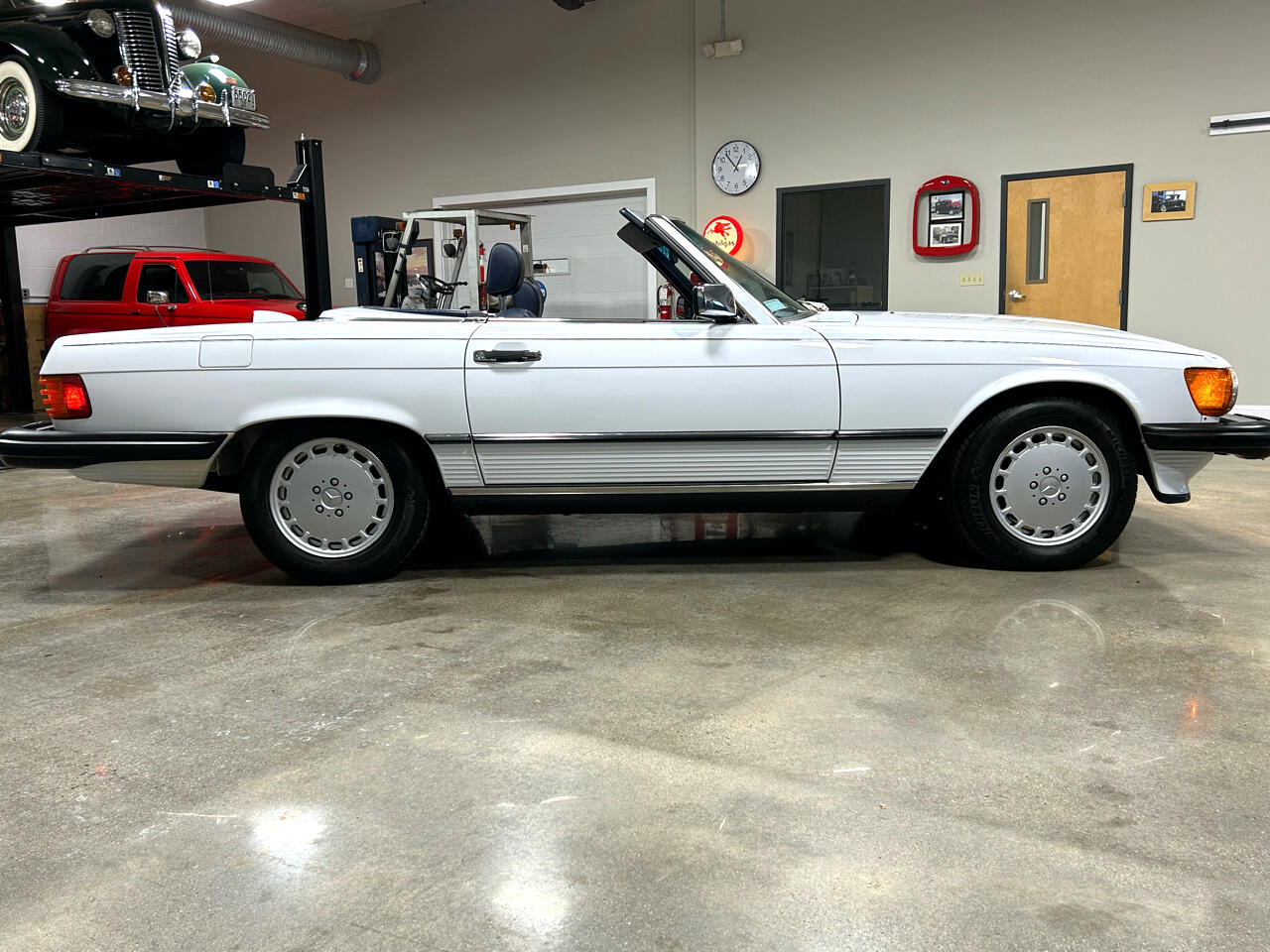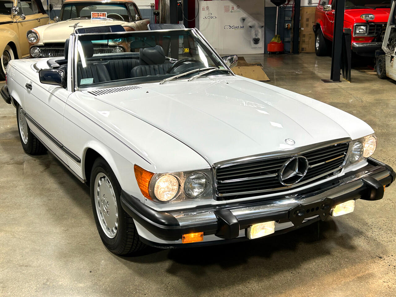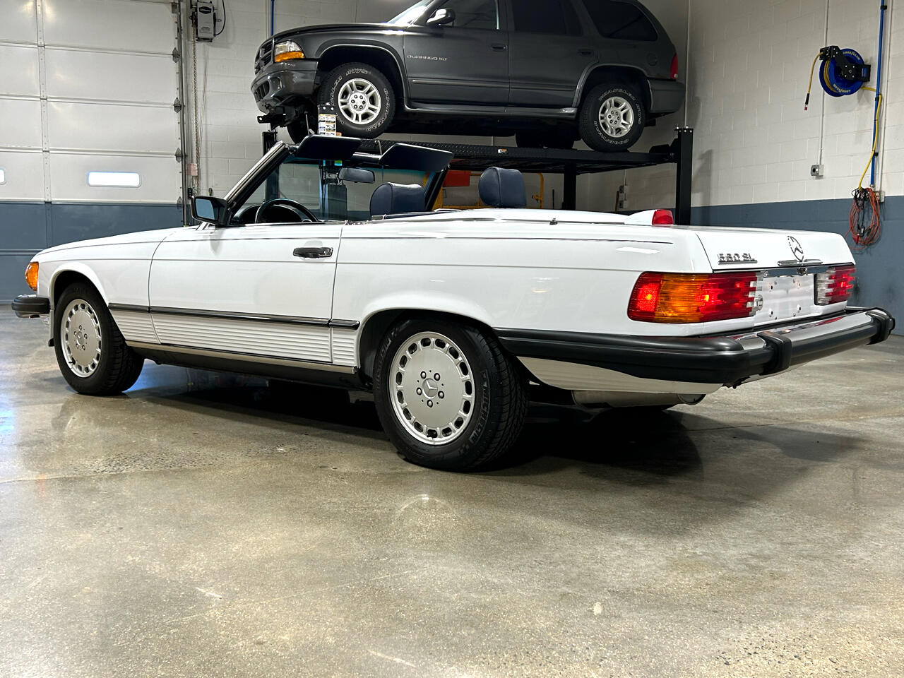 This 1987 Mercedes-Benz 560SL was purchased new by the current owner from Marsh Motors in Hamden, Connecticut, and it shows 28k miles following registration history in that state. Finished in Arctic White over blue leather upholstery, the car is powered by a 5.5-liter V8 paired with a four-speed automatic transmission. Equipment includes a limited-slip differential, a dark blue soft top, a removable hardtop, silver-finished 15? Gullideckel alloy wheels, fog lights, electric windows, central locking, cruise control, and automatic climate control. The car is finished in Arctic White (147) and features a color-matched removable hardtop and a dark blue convertible soft top. Additional exterior equipment includes fog lights, a power antenna, and chrome-accented bumpers and trim. This R107 is offered on dealer consignment with a window sticker, manufacturer’s literature, a clean Carfax report, and a Connecticut title.
