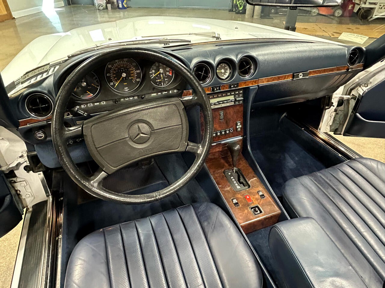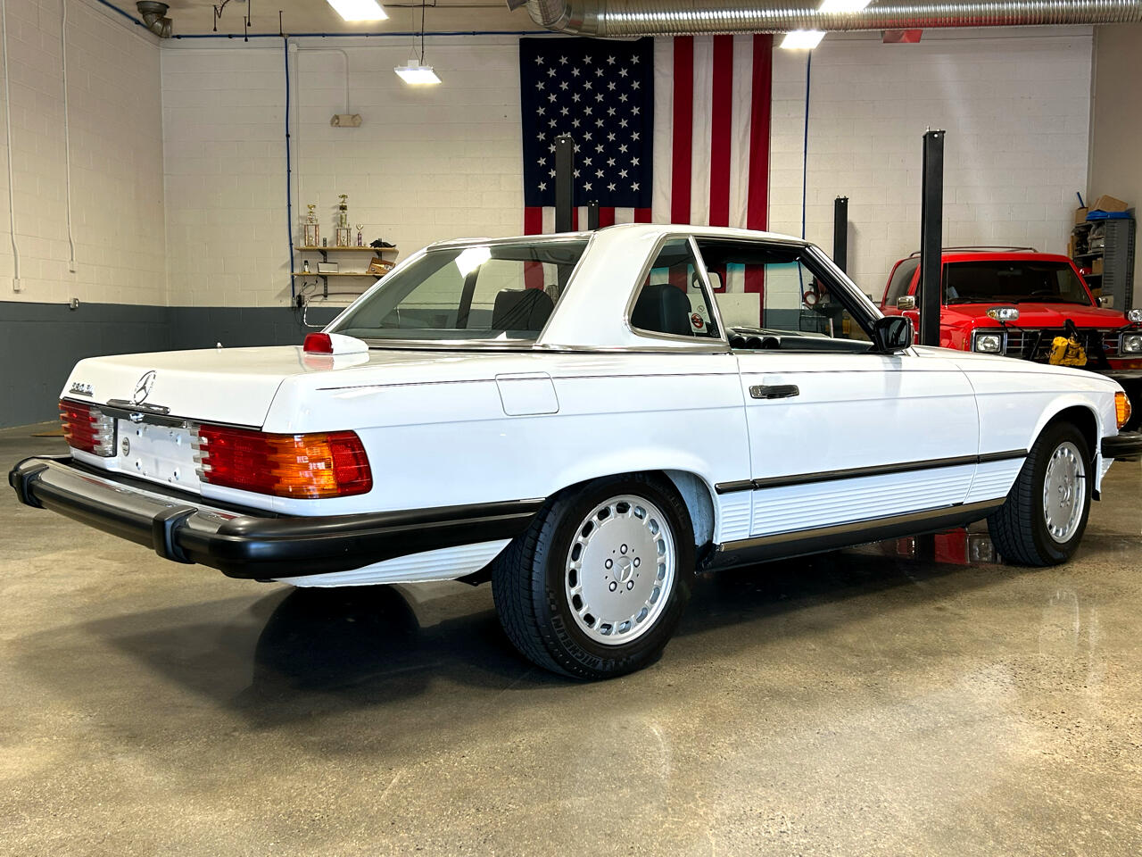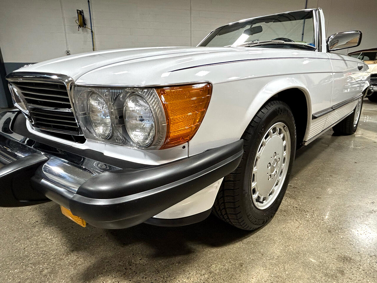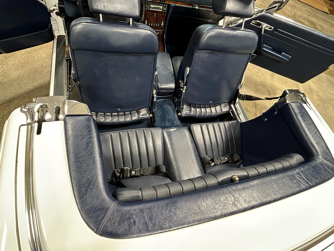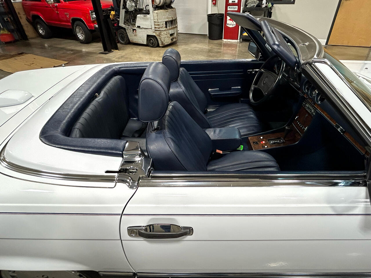 This 1987 Mercedes-Benz 560SL was purchased new by the current owner from Marsh Motors in Hamden, Connecticut, and it shows 28k miles following registration history in that state. Finished in Arctic White over blue leather upholstery, the car is powered by a 5.5-liter V8 paired with a four-speed automatic transmission. Equipment includes a limited-slip differential, a dark blue soft top, a removable hardtop, silver-finished 15? Gullideckel alloy wheels, fog lights, electric windows, central locking, cruise control, and automatic climate control. The car is finished in Arctic White (147) and features a color-matched removable hardtop and a dark blue convertible soft top. Additional exterior equipment includes fog lights, a power antenna, and chrome-accented bumpers and trim. This R107 is offered on dealer consignment with a window sticker, manufacturer’s literature, a clean Carfax report, and a Connecticut title.