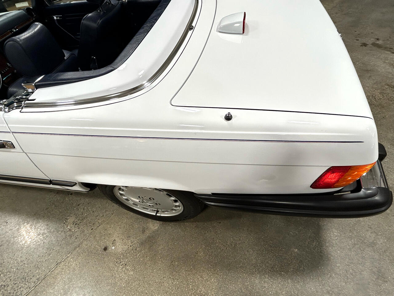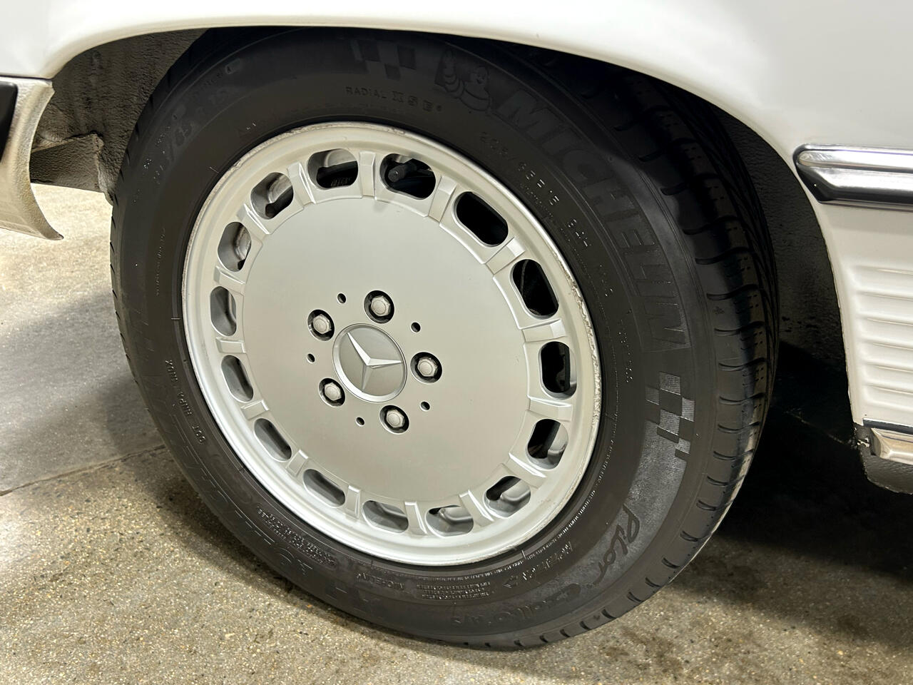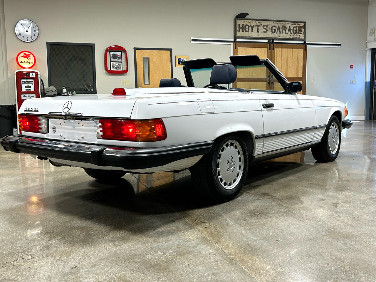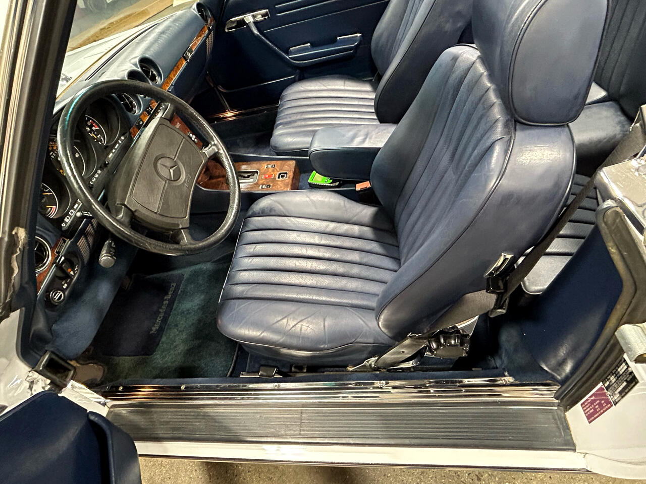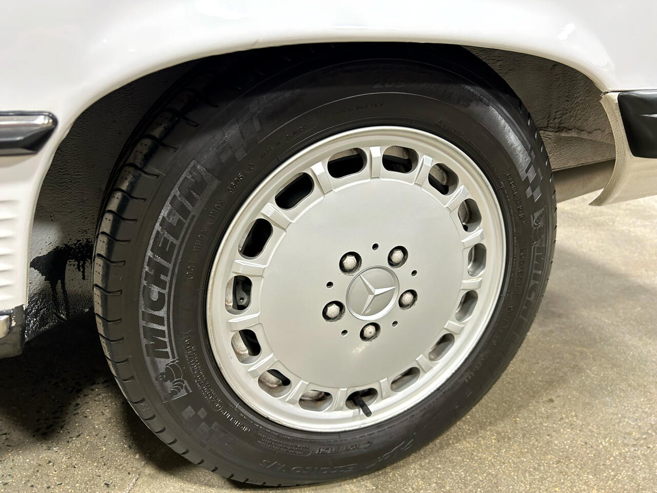 This 1987 Mercedes-Benz 560SL was purchased new by the current owner from Marsh Motors in Hamden, Connecticut, and it shows 28k miles following registration history in that state. Finished in Arctic White over blue leather upholstery, the car is powered by a 5.5-liter V8 paired with a four-speed automatic transmission. Equipment includes a limited-slip differential, a dark blue soft top, a removable hardtop, silver-finished 15? Gullideckel alloy wheels, fog lights, electric windows, central locking, cruise control, and automatic climate control. The car is finished in Arctic White (147) and features a color-matched removable hardtop and a dark blue convertible soft top. Additional exterior equipment includes fog lights, a power antenna, and chrome-accented bumpers and trim. This R107 is offered on dealer consignment with a window sticker, manufacturer’s literature, a clean Carfax report, and a Connecticut title.