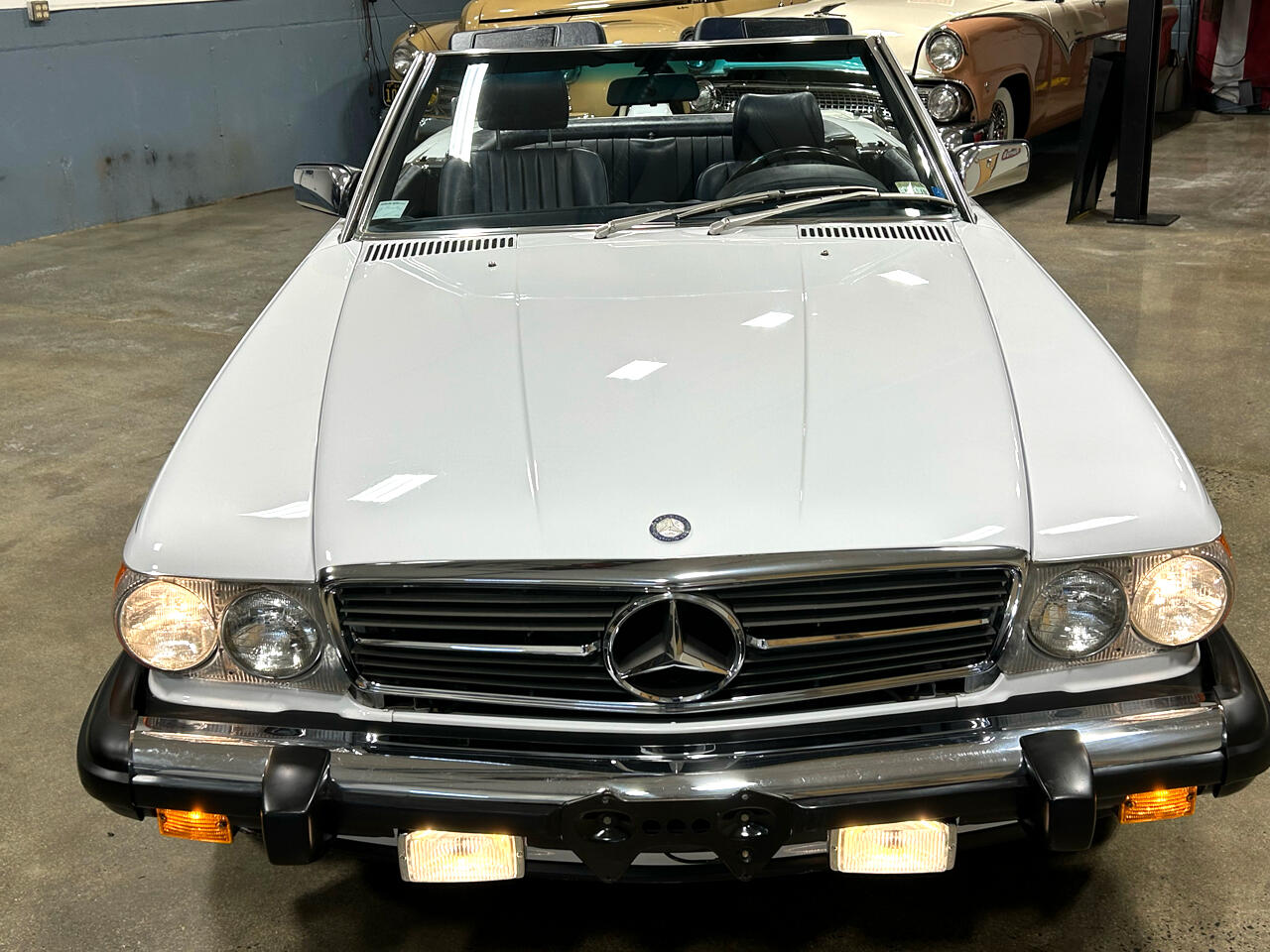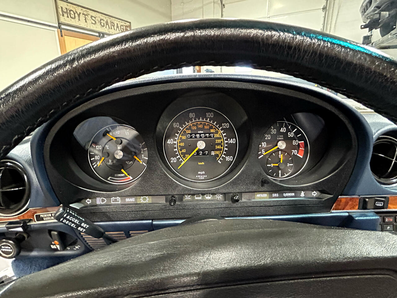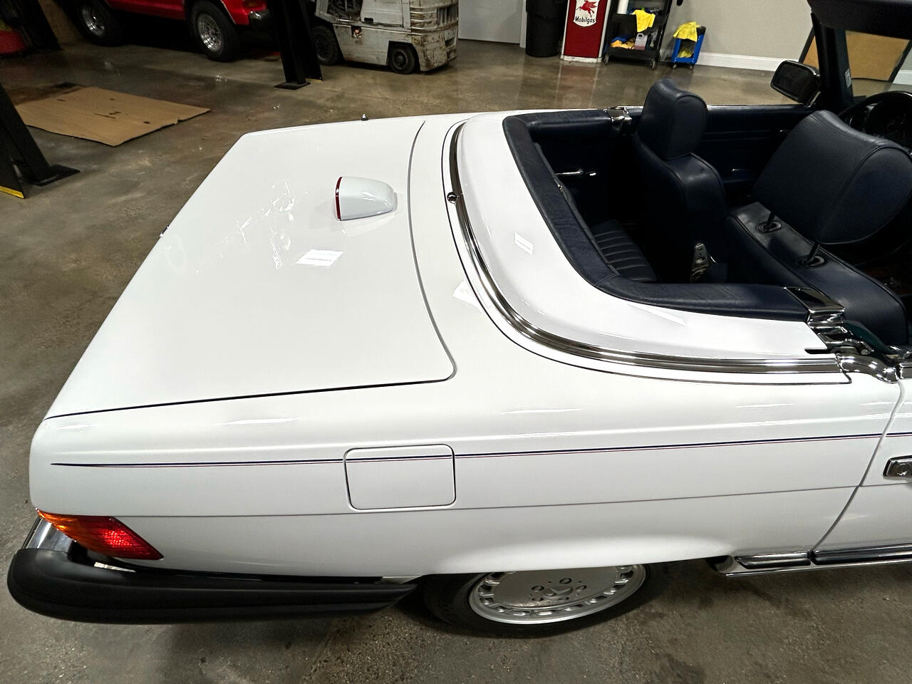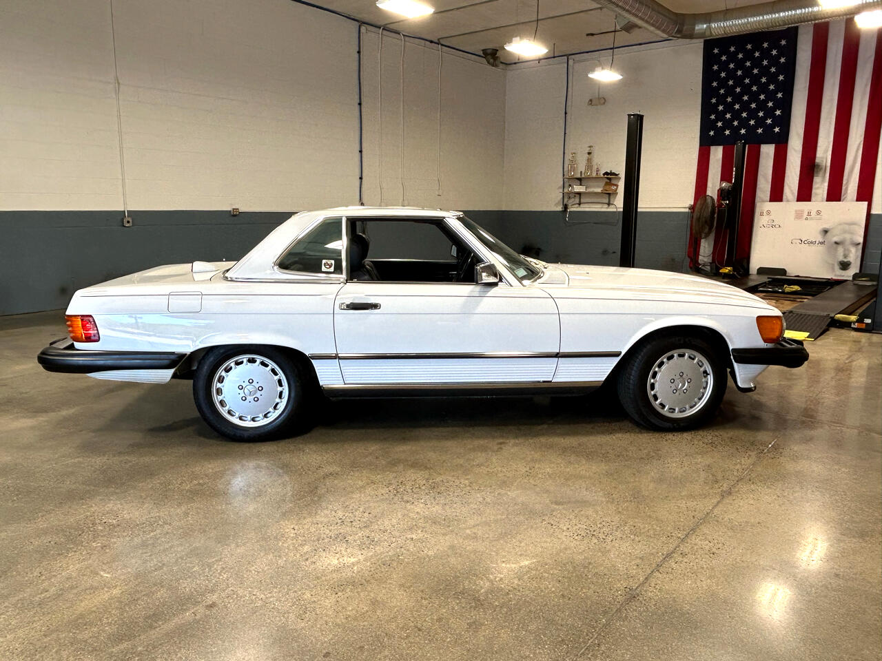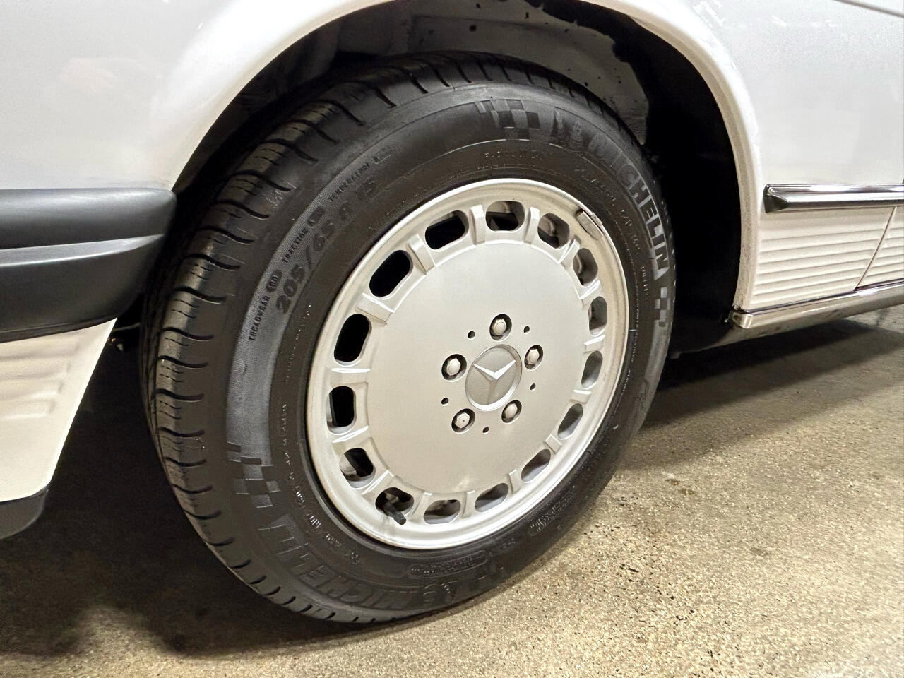 This 1987 Mercedes-Benz 560SL was purchased new by the current owner from Marsh Motors in Hamden, Connecticut, and it shows 28k miles following registration history in that state. Finished in Arctic White over blue leather upholstery, the car is powered by a 5.5-liter V8 paired with a four-speed automatic transmission. Equipment includes a limited-slip differential, a dark blue soft top, a removable hardtop, silver-finished 15? Gullideckel alloy wheels, fog lights, electric windows, central locking, cruise control, and automatic climate control. The car is finished in Arctic White (147) and features a color-matched removable hardtop and a dark blue convertible soft top. Additional exterior equipment includes fog lights, a power antenna, and chrome-accented bumpers and trim. This R107 is offered on dealer consignment with a window sticker, manufacturer’s literature, a clean Carfax report, and a Connecticut title.
